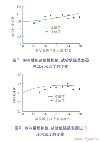 其他參數(shù)不變,制冷性能系數(shù)、制冷量模擬值、試驗值隨蒸發(fā)器進口冷水溫度的變化分別見圖7、8。由圖7可知,制冷性能系數(shù)模擬值隨蒸發(fā)器進口冷水溫度的增大而增長,但增長的幅度比較平緩。制冷性能系數(shù)試驗值先隨蒸發(fā)器進口冷水溫度的增大而提高,然后出現(xiàn)下降的趨勢,但整體呈上升趨勢。由圖8可知,制冷量的模擬值、試驗值隨蒸發(fā)器進口冷水溫度的增大先稍稍增大,然后趨于平緩,只是在蒸發(fā)器進口冷水溫度較高時出現(xiàn)了略微下降,模擬值與試驗值的變化趨勢比較一致。