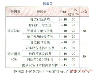 燃?xì)夤艿赖娘L(fēng)險(xiǎn)評(píng)價(jià)方法通常以W.Kent Muhlbaue提出的風(fēng)險(xiǎn)評(píng)價(jià)模型(評(píng)分法)為依據(jù),在W.Kent Muhlbaue所著的《管道風(fēng)險(xiǎn)管理手冊(cè)》中確定的4類評(píng)分指標(biāo)分別是第三方指數(shù)、腐蝕指數(shù)、設(shè)計(jì)指數(shù)、誤操作指數(shù)[3],對(duì)長(zhǎng)輸油氣管道有很強(qiáng)的針對(duì)性,不一定完全適用于城市埋地燃?xì)夤艿馈T诒疚脑u(píng)分指標(biāo)體系的構(gòu)建中,將把文獻(xiàn)[3]評(píng)分法中不相關(guān)、不適應(yīng)的指標(biāo)予以剔除,根據(jù)城鎮(zhèn)燃?xì)夤艿赖奶攸c(diǎn)對(duì)指標(biāo)重新分類,并進(jìn)行適當(dāng)調(diào)整和補(bǔ)充,確定4大評(píng)分指數(shù),分別為腐蝕指數(shù)、外界干擾指數(shù)、管道缺陷指數(shù)、管道附屬設(shè)備失效指數(shù)。城市燃?xì)夤艿里L(fēng)險(xiǎn)評(píng)價(jià)評(píng)分表見(jiàn)表2。