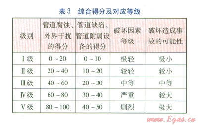 分別對(duì)上述各項(xiàng)進(jìn)行專家評(píng)分,在確定各項(xiàng)的得分后,將得分相加得出各項(xiàng)破壞因素的綜合評(píng)分,按照表3確定各項(xiàng)破壞因素評(píng)估的等級(jí)。得分越高,管道可能遭受此種因素破壞的等級(jí)越高,管道的綜合安全狀況也越差。