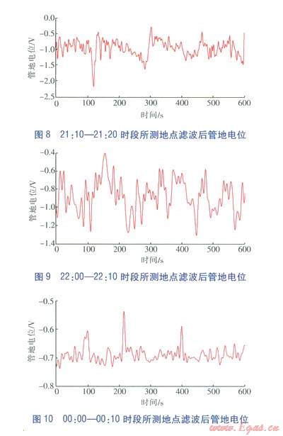 由各時(shí)段管地電位變化可得,軌道交通運(yùn)行期間管地電位存在很大波動(dòng),圖2為軌道交通正常運(yùn)行期間機(jī)車通過測試點(diǎn)時(shí)管地電位變化,電位波動(dòng)有明顯峰值,極大值與極小值分別為0 V、-2.5 V; 圖4為單列運(yùn)行期間無機(jī)車通過測試點(diǎn)時(shí)管地電位變化,由于其他位置通過機(jī)車電流的影響,管地電位仍有明顯波動(dòng),但幅值較機(jī)車通過時(shí)刻有所減小;圖6中軌道交通停運(yùn)后,管地電位波動(dòng)明顯減小,但高頻采集數(shù)據(jù)中存在干擾信號(hào),數(shù)據(jù)頻繁對稱波動(dòng),需要進(jìn)行濾波處理。所測結(jié)果表明所測地段燃?xì)夤艿朗艿诫s散電流干擾,且雜散電流的產(chǎn)生與軌道交通運(yùn)行有直接關(guān)系。