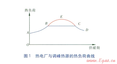 熱電廠與峰荷熱源的熱負荷曲線見圖l。由圖1可知,從供暖期開始至供暖期結(jié)束,基本熱負荷曲線為ABCD,當進入嚴寒期,峰荷熱源投入運行,尖峰熱負荷曲線為BEC。采用圖l的熱負荷曲線運行,熱電廠從供暖期開始至結(jié)束,承擔的熱負荷比較平穩(wěn)。若尖峰熱負荷由熱電機組承擔,由此導致的多余電力消納將成為問題。