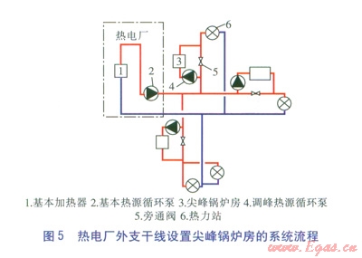 熱電廠外支干線設置尖峰鍋爐房(系統(tǒng)流程見圖5)。由圖5可知,與設置在熱電廠外主干線的峰荷熱源不同之處為尖峰鍋爐房設置在熱網(wǎng)的支干線上,尖峰鍋爐房負責某個分支的尖峰熱負荷。尖峰鍋爐房可以新建,也可以利用原有小區(qū)的供熱鍋爐房。對于這種設置方式,峰荷熱源的投資、運營方均為供熱公司。