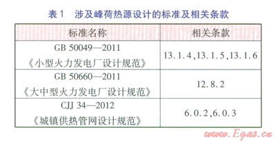 目前,涉及峰荷熱源設計的標準及相關(guān)條款見表1。針對小型火力發(fā)電廠,GB 50049-2011第