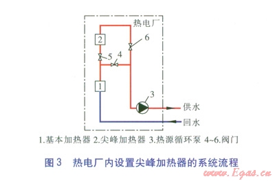 熱電廠內(nèi)設置尖峰加熱器(系統(tǒng)流程見圖3)。由圖3可知,當供暖期處于初末寒期時,閥門4開啟,閥門5、6關(guān)閉,尖峰加熱器不投入運行。當進入嚴寒期時,閥門4關(guān)閉,閥門5、6開啟,尖峰加熱器投入運行。雖然采用尖峰加熱器作為峰荷熱源的造價較低且易于實現(xiàn),但尖峰加熱器需較高參數(shù)的蒸汽,對發(fā)電量有一定影響。對于這種設置方式,峰荷熱源的投資、運營方均為熱電廠。