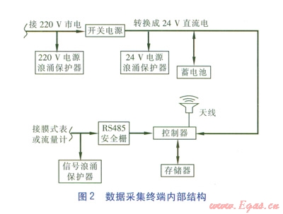 數(shù)據(jù)采集終端(DTU)是遠(yuǎn)傳抄表系統(tǒng)的重要設(shè)備之一,具有RS485/232接口,通信速率為300~115 200 bit/s,通信協(xié)議采用MODBUS RTU/ASC Ⅱ工業(yè)通信協(xié)議,內(nèi)部供電為24 V直流電。l個(gè)數(shù)據(jù)采集終端一般接1~3只燃?xì)獗怼?shù)據(jù)采集終端內(nèi)部結(jié)構(gòu)見圖2。