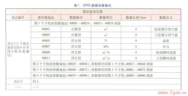 完整的遠(yuǎn)傳抄表數(shù)據(jù)包內(nèi)有兩種類型的數(shù)據(jù),一種是模擬量數(shù)據(jù),如流量、壓力、溫度等,通過內(nèi)部控制模塊轉(zhuǎn)換成數(shù)字量數(shù)據(jù);另一種是狀態(tài)信號(hào)數(shù)據(jù),如市電狀態(tài)、采集終端柜門狀態(tài)等開關(guān)量數(shù)據(jù)。GPRS數(shù)據(jù)采集格式見表l。