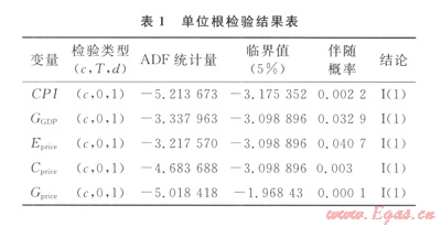 1中,檢驗(yàn)類型(c,T,d)分別代表所檢驗(yàn)的序列中含有截距、時(shí)間趨勢以及滯后階數(shù);按AIC準(zhǔn)則確定滯后階數(shù)。結(jié)果表明,CPI、GGDP、EpriceCprice、Gprice的水平值都是非平穩(wěn)的,但其一階差分是平穩(wěn)的(ADF檢驗(yàn)即增廣迪基-福勒檢驗(yàn),其統(tǒng)計(jì)量的絕對值大于臨界值的絕對值,表示變量平穩(wěn)),因此,這5個(gè)變量序列都是在95%置信水平下的一階單整序列[