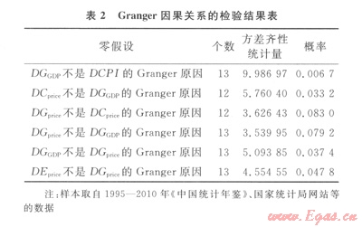 Granger因果關(guān)系檢驗(yàn)中,可以較直觀地分析出變量之間的關(guān)系,得出以下結(jié)論:①在10%的顯著水平下,DGpriceDCpriceGranger原因;10%的顯著水平下,DGpriceDGpriceGranger原因;5%的顯著水平下,DGGDPDCPIGranger原因;5%的顯著水平下,DEpriceDGpriceGranger原因。