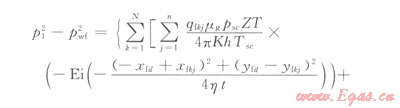 將裂縫單翼均等分成竹份,每等份可以看成是一個點匯。利用無限大均勻地層點匯定流量的壓降公式,可以求出該點匯對地層中任意一點產(chǎn)生的壓降[8-10];將地層任意一點替換為裂縫尖端,就可以得到所有點匯同時生產(chǎn)時對裂縫尖端產(chǎn)生的壓降;考慮到裂縫半長遠大于水平井筒半徑,裂縫內(nèi)流體從裂縫邊緣向井筒周圍聚集,第i條裂縫可以看成是流動直徑為裂縫長度、地層厚度為裂縫寬度、邊界壓力為裂縫尖端壓力、井底流壓為水平井井筒內(nèi)壓力的微型平面徑向流油藏;根據(jù)壓力連續(xù)和流量守恒方程,就能得到考慮裂縫干擾的壓裂水平井油井產(chǎn)量預(yù)測模型[2,5];進一步根據(jù)壓力函數(shù)的定義和真實氣體狀態(tài)方程,并將地層條件下的產(chǎn)量換算為地面標(biāo)準(zhǔn)情況下氣體產(chǎn)量,就可以得到氣藏壓裂水平井產(chǎn)量預(yù)測模型: