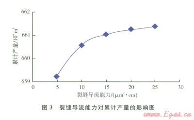 圖3是累計產(chǎn)量與裂縫導(dǎo)流能力的關(guān)系曲線??梢钥闯觯嬖诶塾嫯a(chǎn)量與裂縫長度相似的變化規(guī)律。隨著導(dǎo)流能力增加,累計產(chǎn)量先逐漸增大后趨于平穩(wěn)。要充分發(fā)揮致密氣藏壓裂水平井的潛能,就要使裂縫導(dǎo)流能力與地層滲透率相匹配。本算例中,推薦最佳裂縫導(dǎo)流能力為10~15μm2·cm。