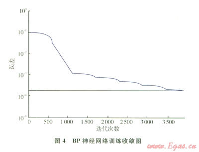 由圖4可知BP神經(jīng)網(wǎng)絡(luò)的收斂性良好,說明程序的下一步預(yù)測有效。表3為BP神經(jīng)網(wǎng)絡(luò)預(yù)測值與實(shí)際值的對(duì)比和誤差。