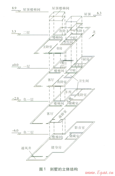 該建筑物共有21個(gè)主要功能房間(包含衛(wèi)生間、車庫、儲(chǔ)藏室等),兩個(gè)豎向氣流通道(樓梯間、中庭)。樓梯間是貫通負(fù)二層至屋頂?shù)娜诵型ǖ?。中庭從一層通至屋頂,類似于舊式建筑的天井,是與室外相通的空間。別墅的立體結(jié)構(gòu)見圖1,圖中各層標(biāo)高的單位為m。