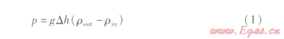 熱壓自然通風(fēng)是指由于不同溫度空氣間的密度差異產(chǎn)生自發(fā)空氣流動(dòng)的通風(fēng)換氣方式[6]。當(dāng)室內(nèi)空氣溫度高于室外空氣溫度,且不同高度存在開口時(shí),空氣通過下部開口進(jìn)入,由上部開口流出。開口之間空氣流動(dòng)動(dòng)力(即熱壓)p的計(jì)算式為: