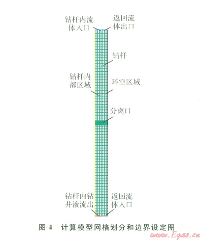 井下多相流分離的順利實施是多梯度鉆井技術(shù)實現(xiàn)的關(guān)鍵。采用FLUENT混合物(Mixture)模型[7-8]建立空心球注入模型,網(wǎng)格劃分及邊界條件如圖4所示。假設(shè)混合了空心球的鉆井液是不可壓縮流體,由于正常鉆進時鉆井液的流量基本恒定,可假定鉆井液的流動是定常流動。在直角坐標中混合流體的運動控制方程[9]: