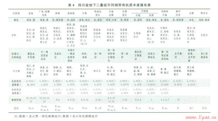 四川盆地下二疊統(tǒng)按J.L.Wilson(1974,1975)沉積相帶劃分[10],統(tǒng)計的有機質(zhì)豐度值列于圖5、表4中。由其可見,碳酸鹽巖烴源巖有機質(zhì)含量較高,有利于碳酸鹽巖烴源巖氣成藏。