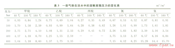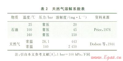 微石油[可溶有機質(zhì)(瀝青)、液態(tài)碳氫化合物等]、水在有機質(zhì)成烴演化進程中,既是有機質(zhì)的成烴產(chǎn)物,又是天然氣的溶解載體;水既參與演變,又充當(dāng)微石油、溶解天然氣的載體。其溶解量則與溫度、壓力等外在因素相關(guān)(表2、3)。