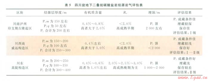 基于對碳酸鹽巖烴源巖氣與頁巖氣成藏機制類同的認(rèn)識,在現(xiàn)今頁巖氣評估標(biāo)準(zhǔn)尚無定論的實際情況下,僅以碳酸鹽巖烴源巖展布、有機質(zhì)豐度、有機質(zhì)成熟度、埋深、圈閉等諸因素綜合分析得出以下評估結(jié)果:以川南瀘州印支期古隆起為最有利區(qū),P1碳酸鹽巖烴源巖厚度較大,有機質(zhì)豐度較高,成熟度適中,埋藏較深,圈閉保藏佳,評為最有利區(qū)(Ι級);川西南威遠構(gòu)造區(qū)為有利區(qū)(Ι-Ⅱ級);川東高陡構(gòu)造區(qū)為較有利區(qū),P1碳酸鹽巖烴源巖厚度大,但成熟度較高及埋藏較淺,其烴氣保存條件不如瀘州印支期古隆起區(qū),故列為Ⅱ級(表5)。
