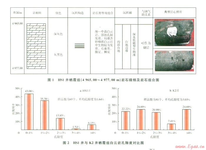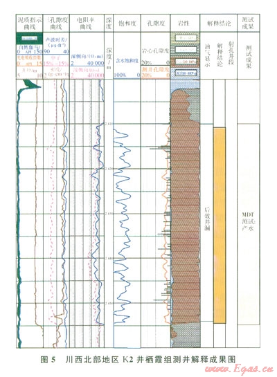 當(dāng)儲(chǔ)層內(nèi)的流體為低礦化度的地層水或淡水時(shí),由于水中呵移動(dòng)的導(dǎo)電離子數(shù)大量減少,從而導(dǎo)致電阻率值增加,在測(cè)井電阻率曲線上則表現(xiàn)出高電阻率特征。由于隨著勘探程度的不斷提高,勘探家們?cè)絹碓秸J(rèn)識(shí)到淡水地層的電阻率類同氣層,電阻率值較高,因而按常規(guī)解釋易出偏差,這也是HS1井柄霞組水層呈現(xiàn)出高電阻率特征易解釋失誤的原因。K2井棲霞組巖性主要為淺灰-灰色細(xì)-中晶白云巖,粗晶(砂糖狀)白云巖發(fā)育。巖心分析物性表明,孔隙度分布范圍介于0.42%~l 6.61%,孔隙度在各個(gè)區(qū)間分布較為平均,平均孔隙度為3.03%,明顯較HS1井高(圖2),儲(chǔ)層物性特征明顯較致密的HS1井好,屬于中等-好儲(chǔ)層。從K2井儲(chǔ)層測(cè)井解釋看,棲霞組儲(chǔ)層電性特征具有低伽馬值、高電阻率、相對(duì)較高的聲波時(shí)差特征,無疑具有典型的氣層特征(圖5)。但通過該井MDT取樣分析卻表明:儲(chǔ)層段產(chǎn)水。根據(jù)本井MDT水樣分析資料,其Cl-含量?jī)H164 mg/L礦化度低,反映儲(chǔ)層中的水為淡水特征。