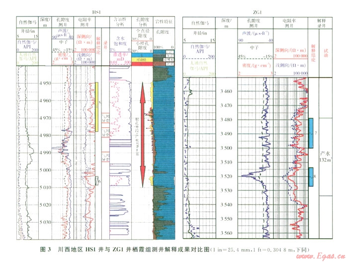 在地質(zhì)歷史時(shí)期,同一地區(qū)的不同構(gòu)造應(yīng)具有相同或者相似的成藏條件。同樣位于川西南部地區(qū)的周公山構(gòu)造的ZG1井棲霞組儲(chǔ)層電性特征為低伽馬值、低電阻率、高聲波時(shí)差特征,特別是8號(hào)儲(chǔ)層,具有典型的水層特征,測(cè)試結(jié)果也證實(shí)流體性質(zhì)為地層水。為什么同為棲霞組儲(chǔ)層,在不同構(gòu)造上卻顯示出不同測(cè)井響應(yīng)特征,一個(gè)儲(chǔ)層為高電阻率特征,另一個(gè)儲(chǔ)層為低電阻率特征。根據(jù)HS1井與ZG1井對(duì)比分析表明,HS1井巖心物性較ZG1井物性差,該井柄霞組巖石滲透性差,巖性致密,從鏡下薄片看,HS1井柄霞組孔隙不發(fā)育且為一些孤立的孔隙,從而導(dǎo)致該層段電性特征表現(xiàn)為低伽馬值、高電阻率、相對(duì)較高的聲波時(shí)差氣層特征(圖3)。也就是說HS1井的高電阻率特征并不反映儲(chǔ)層內(nèi)流體的情況,而是對(duì)該層段巖石致密性的一個(gè)高電阻率特征反映。
