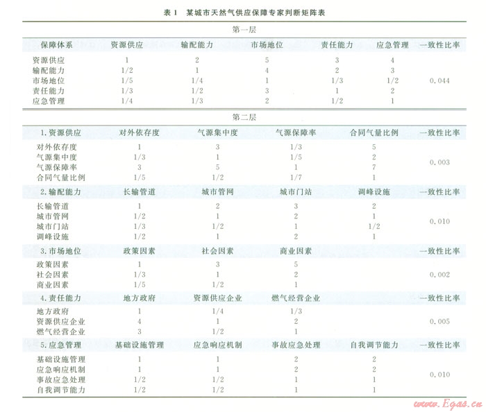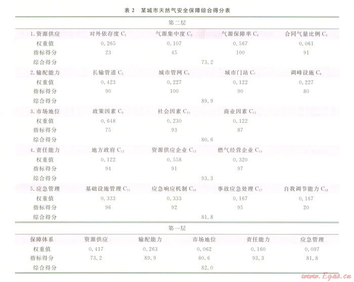 本文從天然氣產(chǎn)、運、銷物流系統(tǒng)整體出發(fā),同時納入“政府、企業(yè)、用戶”三方責(zé)任承擔(dān)與應(yīng)急管理評價指標(biāo),形成一套城市供氣安全的綜合保障評價體系。同時采用成熟的層次分析法建立數(shù)學(xué)模型,分別計算指標(biāo)權(quán)重與模型得分,定性分析和定量計算相結(jié)合,對城市的供氣保障形成直觀認識。計算實例表明,模型在分析影響城市供氣安全不利因素、提高認識的準(zhǔn)確水平,以進一步增強城市供氣保障措施和安全系數(shù),具有一定的輔助分析作用。
