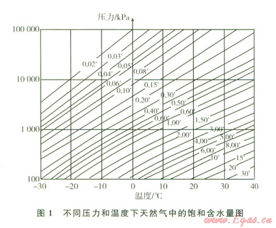 同時(shí),在新版ISO/TR l5403-2-2006的附錄E中列出了如圖l所示的不同壓力和溫度下天然氣中的飽和含水量,此圖是根據(jù)“天然氣水含量與水露點(diǎn)之間的關(guān)聯(lián)”(GB/T 22634-2008、ISO 18453-2004)制作的。圖1表明:天然氣中含水量小于30 mg/m3時(shí),在25 MPa高壓下,其水露點(diǎn)低于-l3℃。這對(duì)于中國大部分地區(qū)均適用。
