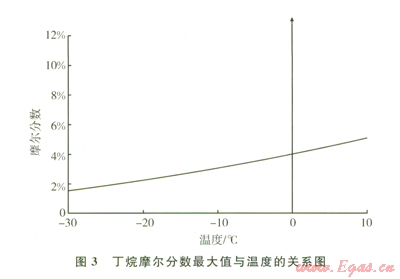 根據(jù)“壓縮天然氣汽車燃料推薦做法”(SAEJ1616-1994)的規(guī)定,新版ISO 15403-1-2006推薦在可能達(dá)到的最低環(huán)境溫度和最高操作(或儲(chǔ)存)壓力下,CNG中冷凝液態(tài)烴的總量應(yīng)不超過1%(摩爾分?jǐn)?shù))。壓力在6 000~10 000 kPa范圍內(nèi)要求冷凝液態(tài)烴總量不超過l%時(shí),不同溫度下CNG中相應(yīng)的最大丙烷和丁烷含量分別如圖2、3所示。