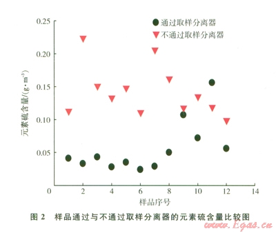 同時(shí),為避免水和顆粒物等對(duì)井口取樣準(zhǔn)確性的影響,常規(guī)天然氣分析常會(huì)采用取樣分離器。但從試驗(yàn)研究結(jié)果來看,樣品通過取樣分離器取樣測(cè)定的元素硫含量低于樣品不通過取樣分離器取樣測(cè)定的元素硫含量(圖2)。岡此,元素硫取樣方案中應(yīng)明確提出采用樣品不通過取樣分離器方式進(jìn)行取樣,這是準(zhǔn)確測(cè)定元素硫含量的關(guān)鍵環(huán)節(jié)。