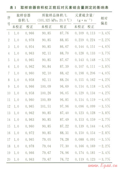 為了保證取樣時(shí)取樣容器中不含影響測(cè)定準(zhǔn)確性的水和氧氣等干擾物,在取樣前對(duì)容器進(jìn)行干燥和無氧化處理是非常重要的。同時(shí)由于計(jì)算元素硫含量時(shí),需要掌握樣品在標(biāo)準(zhǔn)參比條件(我國(guó)為101.325kPa,20.0℃)下的體積。而天然氣樣品是采集在壓力下的取樣容器中的,當(dāng)已知取樣容器的容積、樣品的壓力和氣體在壓力下的壓縮岡子,根據(jù)氣體狀態(tài)方程,可計(jì)算天然氣樣品在標(biāo)準(zhǔn)參比條件下的體積。因此,如何準(zhǔn)確測(cè)定取樣容器的容積是實(shí)施測(cè)定前必須考慮的關(guān)鍵因素之一。表l為取樣容器進(jìn)行容積校正前后對(duì)元素硫測(cè)定結(jié)果的影響程度??梢钥闯?,取樣容器未校正元素硫含量值比校正元素硫含量值低2%~5%。