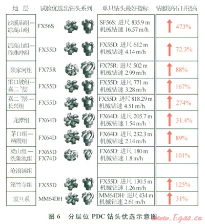 通過試驗與優(yōu)化改進PDC鉆頭,逐步優(yōu)選出適應(yīng)各層位的PDC鉆頭型號(圖6),機械鉆速和單只鉆頭進尺大幅度提高,第二批正鉆井在沙溪廟地層試驗剛體PDC鉆頭取得新進展,平均機械鉆速由傳統(tǒng)胎體PDC鉆頭7.24m/h提高到16.27m/h(表1),已接近空氣鉆進效果。