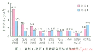 海相地層占全井進尺的57%(約3000m),巖石強度高,硅質(zhì)含量重,部分層段含燧石結(jié)核和角礫云巖,機械鉆速極低,高科1井、高石l井各地層平均機械鉆速統(tǒng)計如圖1所示,不能采用氣體鉆提速的陸相碎屑巖地層的平均機械鉆速小于2.50m/h,嚴重影響了全井鉆井速度。