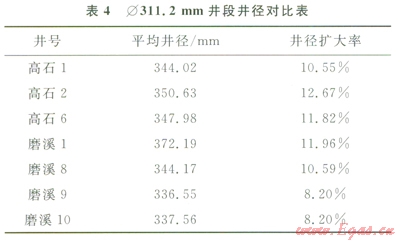 有機鹽鉆井液體系在高石2井、高石6井、磨溪8井、磨溪9井、磨溪l0井的Æ311.2mm井段和Æ215.9mm井段現(xiàn)場應(yīng)用。表4為高石2、高石6、磨溪8、磨溪9、磨溪l0井Æ311.2mm井段應(yīng)用有機鹽鉆井液的平均井徑對比數(shù)據(jù),轉(zhuǎn)換為有機鹽體系后的滾動回收率均提高,機械鉆速明顯提高,平均井徑擴大率明顯降低(表4),高石2井等井由于上部氣體鉆形成的大井徑,造成井徑擴大率偏高。