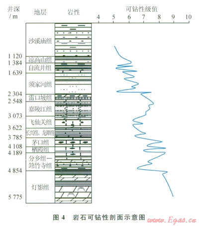 四川盆地深井—超深井鉆井提速一直是制約天然氣勘探開發(fā)的難題,氣體欠平衡鉆井、PDC鉆頭的應(yīng)用一定程度提高了深井鉆井速度,但還不能滿足國家經(jīng)濟發(fā)展對天然氣勘探開發(fā)的形勢和要求。而四川中部地區(qū)的樂山 龍女寺古隆起儲層埋藏深,垂直井深超過5000m,鉆遇地層類型多,巖性復雜,提高鉆井速度遇到以下4個方面的工程地質(zhì)難點。
