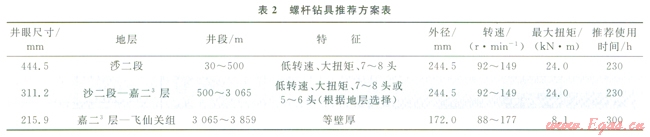 鉆井提速技術(shù)已經(jīng)廣泛應(yīng)用PDC鉆頭+螺桿鉆具的復合鉆井模式[2],螺桿的使用增加了井底鉆頭轉(zhuǎn)速從而大幅提高鉆井速度。但常規(guī)螺桿鉆具在大尺寸井段的扭矩不足,隨著井底溫度升高也會對螺桿定子橡膠產(chǎn)生影響[5-6],通過對不同井眼尺寸的螺桿鉆具應(yīng)用試驗效果進行分析,推薦了螺桿鉆具應(yīng)用的參數(shù)要求(表2),從而更好地與PDC鉆頭使用時間匹配: