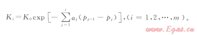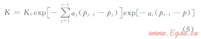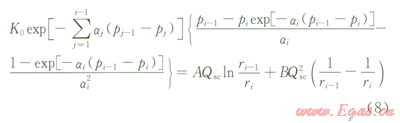 在Pi≤P≤i-1內(nèi)(其對應的徑向距離ri≤r≤ri-1),儲層滲透率可以表示為: