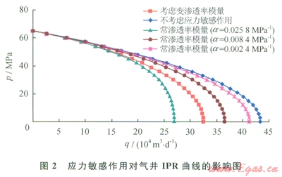 圖2為應力敏感作用對氣井IPR曲線的影響,從圖中可以看到,應力敏感作用會使氣井的產(chǎn)量降低,特別是在井底流壓較低時,產(chǎn)量降低得越嚴重;對于滲透率模量計算的IPR曲線,在相同的井底流壓下,常滲透率模量越大,氣井的產(chǎn)量越低;對于該氣井用變滲透率模量計算的IPR曲線與用常滲透率模量計算的IPR曲線在形態(tài)上具有相似性,但是當井底流壓較小時,用變滲透率模量計算的產(chǎn)量與用常滲透率模量計算的產(chǎn)量差異較大,由于變滲透率模量更能夠反映儲層的滲流特征,因此用傳統(tǒng)的常滲透率模量計算的產(chǎn)量可能會錯誤估計應力敏感作用對氣井產(chǎn)量的影響。