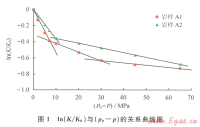 采用擬三軸應力巖心夾持器測定該井取樣巖心在不同有效應力下的滲透率,發(fā)現(xiàn)在儲層壓力范圍為0~65MPa時,表現(xiàn)為變滲透率模量特征,研究發(fā)現(xiàn)可以用3段滲透率模量來表征滲透率隨有效應力變化的關系(表1)。
