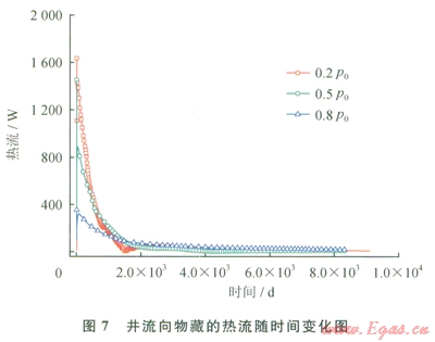 用80m×400m×1m水合物藏開(kāi)采模擬所得數(shù)據(jù),結(jié)合開(kāi)采物藏和井的參數(shù),可計(jì)算減壓和加熱對(duì)水合物分解的貢獻(xiàn)。水合物藏中水合物總質(zhì)量為3.6×106kg。由式(2)可得,完全通過(guò)加熱熔化需要能量1.27×1012J。圖7為井流向物藏的熱流隨時(shí)間變化圖。對(duì)圖7熱流進(jìn)行積分,得到輸入物藏累計(jì)能量變化曲線(圖8)。在0.2P0、42℃條件下,輸人物藏的能量最大,為6.71×1010J。井內(nèi)溫壓條件為0.5P0、42℃時(shí),輸入物藏的能量為5.39×1010J,0.8P0、42℃時(shí),輸人物藏能量為4.39×1010J。由式(1)可得,在0.2P、42℃條件下,加熱分解了5.28%的水合物,其余的水合物由減壓驅(qū)動(dòng)力所分解。而在另外兩種井內(nèi)溫度壓力條件下,加熱分解的水合物量多一些,而減壓所分解的水合物量相比更少一些。