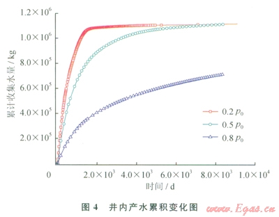 從上述研究成果町以得出,在0.2p0條件下,水合物藏中水合物全部分解,井內(nèi)收集到3.4×105m3的氣體。圖4為0.2p0、42℃,0.5p0、42℃,0.8p0、42℃這3種條件下,井內(nèi)收集水的累積變化圖。從圖4中可以看出,產(chǎn)水集中在開(kāi)采前期1500d,后期產(chǎn)水速率小。在0.5p0、42℃,0.8p0、42℃條件下,也有較大量的水被收集,表明也有較大量的水合物被分解了。圖5為整個(gè)開(kāi)采過(guò)程中3種條件下,井內(nèi)氣水比隨時(shí)間的變化圖。從圖5可以看出,0.2p0、42℃條件下,氣水比一直在增加,最大值達(dá)到304;而0.5p0、42℃條件下,氣水比增加緩慢,最大達(dá)到136;0.8p0、42℃條件下氣水體積比一直接近0,開(kāi)采后期也沒(méi)有改善??梢钥闯?,在井內(nèi)壓力高時(shí),井和物藏間的壓差不夠大,整個(gè)開(kāi)采過(guò)程,分解后的自由氣并沒(méi)有大量流人開(kāi)采井內(nèi)??梢?jiàn)減壓驅(qū)動(dòng)力對(duì)于分解后自由氣在井內(nèi)的收集非常重要。物藏和井之間壓差太小,自由氣一直留在物藏內(nèi),無(wú)法在井內(nèi)被收集。