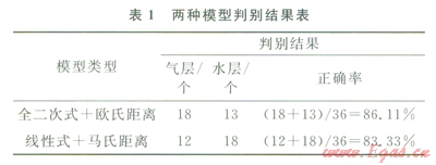 從表l中可以看出,兩個模型對整個樣本的判別正確率均在75%以上,統(tǒng)計意義上是有效的判別模型[16-17]。判別結(jié)果顯示,歐氏模型對氣層確實有很好的識別效果,而馬氏模型對水層有很好的識別效果,說明了各氣體組分之間的相互關(guān)系是氣測資料識別流體性質(zhì)的基礎(chǔ),在流體判別模型中采用不同空間距離計算方法確實能提高模型識別不同流體性質(zhì)的能力。