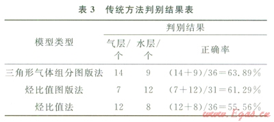 圖1表明筆者提出的儲層流體識別方法均好于3種傳統(tǒng)的方法。傳統(tǒng)方法中以三角形氣體組分圖版法為最好,烴比值圖版法次之,烴比值法再次,與實際應(yīng)用情況相符合。但3種方法的判別止確率均小于75%,從數(shù)理統(tǒng)計角度看判別能力不強,這也是此類方法在識別復雜儲層流體性質(zhì)時效果不好的原因之一。