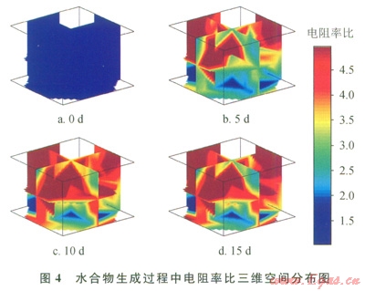 對比圖4a與圖4b發(fā)現(xiàn)電阻率變化量較大,而對比圖4c與圖4d發(fā)現(xiàn)電阻率變化較小。但是圖3中的壓力在整個水合物生成過程中是均勻下降的,表明水合物生成速率較穩(wěn)定,并沒有明顯的減慢趨勢。所以可以認(rèn)為,電阻率與水合物飽和度并不是呈完全的線性關(guān)系。當(dāng)水合物的飽和度升高到一定程度時,電阻率變化減緩。這是由于當(dāng)多孔介質(zhì)中生成一定飽和度的水合物時,水合物會將多孔介質(zhì)中的通道阻塞,引起電阻率迅速上升;但當(dāng)飽和度繼續(xù)上升時,電阻率則變化不大。