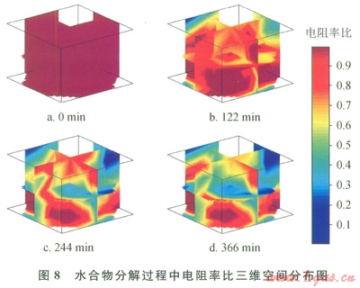 圖8是水合物分解過程中電阻率比三維空間分布圖。如圖8所示,圖8-a為開采前的水合物電阻率比三維分布圖,此時所有測點(diǎn)的電阻率比均為初始值l。圖8-b為開采第l22分鐘的電阻率比三維分布圖,此時水合物開采處于降壓開采階段,可以看見水合物藏內(nèi)的水合物開始分解,并且分解主要集中于上層,這可能是由于開采井位于上層的原因。而圖8-c和圖8-d分別為第244分鐘和第366分鐘的電阻率比云圖,可發(fā)現(xiàn)水合物藏中的電阻率比持續(xù)下降,表明水合物持續(xù)分解。并且在第366分鐘(圖8-d)達(dá)到最低。