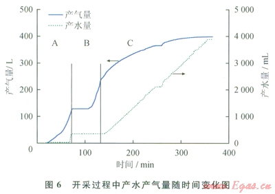 圖6為開采過程中產(chǎn)水、產(chǎn)氣量隨時間變化圖。如圖6所示,水合物開采過程一共歷時366min。3個開采階段的特性分別如下:自由氣釋放階段A中,逐漸產(chǎn)氣約ll5L,并在產(chǎn)氣即將結(jié)束的時候開始產(chǎn)水,共產(chǎn)水約400mL,此階段中的產(chǎn)氣和產(chǎn)水都是原先貯存于水合物藏中的自由氣和自由水;降壓開采階段B中,首先靜置了約30min后,再進(jìn)行降壓分解實(shí)驗(yàn),在降壓過程中共產(chǎn)氣約120L,但是沒有更多的水產(chǎn)出;注熱開采階段C中,共產(chǎn)氣約l50L,產(chǎn)氣速率隨著開采過程的進(jìn)行而降低,最終降低至0。這是由于水合物藏中的水合物逐漸分解完,水合物分解量減小從而導(dǎo)致產(chǎn)氣速率降低。并且在整個水合物注熱開采過程中,產(chǎn)水速率基本保持不變(約為20mL/min),基本與注水速率保持一致。