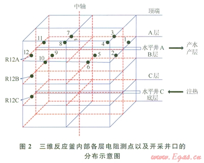 圖2繪出了三維反應(yīng)釜內(nèi)部各層電阻率測點(diǎn)以及開采井口的分布示意圖。從圖2中可以看出,共有l2×3個電阻測點(diǎn)以及分別位于A、C兩層的中心水平井。本實(shí)驗(yàn)中,反應(yīng)釜注熱井為底層水平C井,出口為與注熱井在同一垂直截面上的頂層水平A井。實(shí)驗(yàn)中,壓力由Trafag制造的NAT8251.7425型壓力傳感器測量,測量范圍為0~25MPa,精度為±0.02MPa。溫度由Ptl00鉑電阻測量,測量范圍為-20~200℃,精度為±0.1℃。蒸餾水由平流泵注入,通過中間容器,經(jīng)過加熱罐后被加熱為高溫蒸汽進(jìn)入釜內(nèi)。平流泵為北京創(chuàng)新通恒有限公司制造的P3000型,流量范圍為0~50mL/min,精度為±0.001mL/min,壓力范圍為0~25MPa。加熱罐由南通飛宇有限公司制造,可加熱水至30~190℃,精度為±0.1℃。供氣部分包括甲烷氣瓶、壓力調(diào)節(jié)閥、穩(wěn)壓器、氣體流量計等,氣體流量計采用北京七星D07型質(zhì)量流量控制器,量程為0~10L/min,測量精度為l%。’實(shí)驗(yàn)所用氣體為99.9%的純甲烷氣體,由佛山華特氣體有限公司提供。