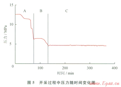 圖5為開采過程中系統(tǒng)壓力隨時間變化圖。如圖5所示,根據(jù)壓力的變化可以把整個開采階段分為3個階段,分別為階段A、階段B和階段C。其中,在階段A中,壓力由生成結(jié)束時的12MPa降低至6.5MPa,而6.5MPa高于此時水合物藏溫度8℃所對應(yīng)的相平衡壓力(5.6MPa),也就是說在階段A中水合物并不分解,所以此階段被稱為自由氣釋放階段。在階段8中,壓力由6.5MPa降低至4.7MPa,在此階段中,由于系統(tǒng)壓力低于相平衡壓力導(dǎo)致水合物開始分解,所以此階段被稱為降壓開采階段。在階段C中,壓力穩(wěn)定在4.7 MPa附近幾乎不變,并且開始通過水平井C注熱開采水合物,所以此階段被稱為注熱開采階段。