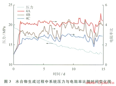 在本項(xiàng)研究中,甲烷水合物生成過程歷時約15天,在此過程中反應(yīng)釜系統(tǒng)壓力由20MPa下降至12MPa。由于本工作所用電極對的電阻探頭在反應(yīng)釜中間距不一致,在這里,筆者同樣利用實(shí)驗(yàn)過程中實(shí)時的電阻率值與實(shí)驗(yàn)開始前的電阻率的比值作為比較的參數(shù)。圖3是在水合物生成過程中系統(tǒng)壓力與電阻率比隨時間變化圖。圖3中以4A、4B和4C作為參考點(diǎn),研究生成過程中A、B、C 3層的電阻率變化區(qū)別。如圖3所示,在甲烷水合物生成的第一和第二天電阻率值同時快速升高,表明在位于4A、4B、4C處的水合物迅速生成。然而在水合物生成的余下約l3天的時間中,系統(tǒng)壓力持續(xù)下降,表明反應(yīng)釜中的水合物在持續(xù)生成,但是電阻率并沒有明顯上升趨勢。這有可能是由于位于4A、4B、4C測點(diǎn)處水合物在前兩天的牛成中已經(jīng)達(dá)到飽和狀態(tài),電阻率無法再升高,而水合物在其他地區(qū)繼續(xù)生成。說明水合物在反應(yīng)釜內(nèi)各點(diǎn)的生成并不是同步的。
