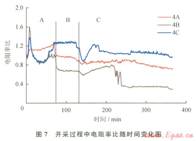 下面研究一下這些開采現(xiàn)象所對應(yīng)的電阻率變化規(guī)律。仍然以4A、4B和4C測點(diǎn)的電阻率為例,研究開采過程中電阻率的變化。圖7為開采過程中電阻率隨時間變化曲線。如圖7所示,在自由氣釋放階段A中,首先由于自由氣的大量放出,導(dǎo)致中層4B和下層4C電阻率下降較為明顯,而在上層4A測點(diǎn)電阻率反而略有上生,這表明氣體通過上層水平井流出,導(dǎo)致各層電阻率變化,并且在自由氣釋放階段的后期由于產(chǎn)水導(dǎo)致中、下層電阻率的上升;在降壓開采過程中,由于水合物分解導(dǎo)致電阻率緩緩下降,但是不明顯,這主要是由于降壓分解降低水合物飽和度,但是并未降低至上文中提到的可以明顯影響電阻率的水合物飽和度值,所以下降并不明顯;在注熱開采初期,由于大量水合物分解導(dǎo)致氣體和水的流動性較大,所以水合物藏內(nèi)的電阻率變化具有一定隨機(jī)性,不過隨著注熱的進(jìn)行,水合物逐漸分解完,導(dǎo)致電阻率總體呈下降趨勢。