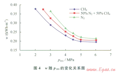 當LNG儲存壓力(P104)為2MPa、氣體制冷劑膨脹前壓力(P204)為5MPa、氣體制冷劑膨脹前預冷溫度(t206)為-30℃時,在一定范圍內(nèi)改變進口天然氣壓力(P101),通過HYSYS軟件模擬計算可得到產(chǎn)品LNG的單位能耗(w),進而得到w隨P101的變化關系(圖4)。由南圖4可知,產(chǎn)品LNG單位能耗隨進口天然氣壓力的增加而降低。這是因為壓力越高,換熱器的平均換熱溫差越小,因而能耗越低。由于進口天然氣壓力的升高對承壓設備的要求也增加,故而不宜太高。因此,取P101為5MPa作為最優(yōu)進口壓力。