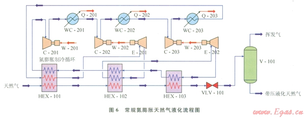 HYSYS模擬的常規(guī)氮膨脹天然氣液化流程如圖6所示[12]。經(jīng)過預處理后的進口天然氣通過換熱器HEX-l01和HEX-l02降溫,然后節(jié)流至l01kPa變?yōu)?span lang="EN-US">LNG,送入儲罐V-101。液化流程所需冷量由氮膨脹制冷循環(huán)提供,由于常規(guī)液化流程所需的低溫更低,若采用單級膨脹會導致膨脹機的膨脹比非常大,故而一般采用兩級膨脹為流程提供冷量和所需的低溫。氮氣制冷劑首先經(jīng)過三級壓縮水冷器,再進入膨脹機E-201膨脹降溫,接著進入換熱器HEX-102為其提供冷量,然后進入膨脹機E-202繼續(xù)膨脹降溫,接著依次通過三級換熱器為其提供冷量,最后復溫回到壓縮機。其中膨脹機E-201和E-202產(chǎn)生的膨脹功分別由壓縮機C-202和C-203完全回收利用,構成兩個壓縮膨脹機組。由于常規(guī)天然氣液化流程的進口天然氣要經(jīng)過CO2預處理,CO2的含量一般不超過0.01%。因此,這里仍舊取99.99%CH4+0.01%CO2作為進口原料氣。