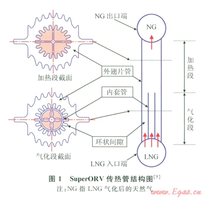 開架式氣化器(ORV)是一種以海水為熱源的氣化器,是液化天然氣(LNG)接收終端中用于基本負荷的大型氣化裝置,但由于海水容易在該氣化裝置底部結冰,使得裝置盼傳熱性能下降,導致其氣化性能無法得到進一步的提升。超級開架式氣化器(SuperORV)是在ORV基礎上二的改進版本,其傳熱管可分為氣化段和加熱段兩部分(圖1)。加熱段中采用雙層結構的傳熱管,使得管外結冰的狀況得到了進有效的改善。據(jù)有關技術數(shù)據(jù)[1-2],SuperORV可以使氣化裝置的氣化能力提高3倍,海水流量和安裝空間可分別減小15%和40%。